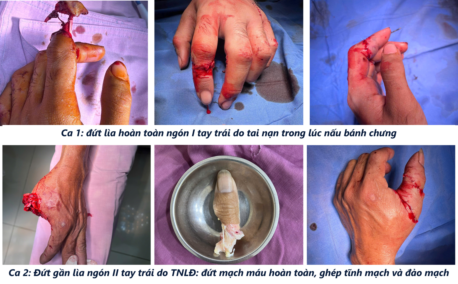 1️⃣🕐 Chỉ một giờ sau, bệnh viện tiếp nhận anh Q.M.H. (25 tuổi, ngụ phường Long Hưng) bị đứt lìa hoàn toàn ngón cái tay trái do nồi bánh chưng đổ trúng tay. Đây là tổn thương nặng vì ngón cái giữ vai trò quan trọng trong chức năng cầm nắm. Ê kíp mổ đã phải ghép thêm đoạn động mạch do mạch máu bị giập đứt nhiều, đồng thời nối gân, thần kinh và cố định xương. Sau gần 5 giờ phẫu thuật, ngón tay đã hồi lưu máu tốt.