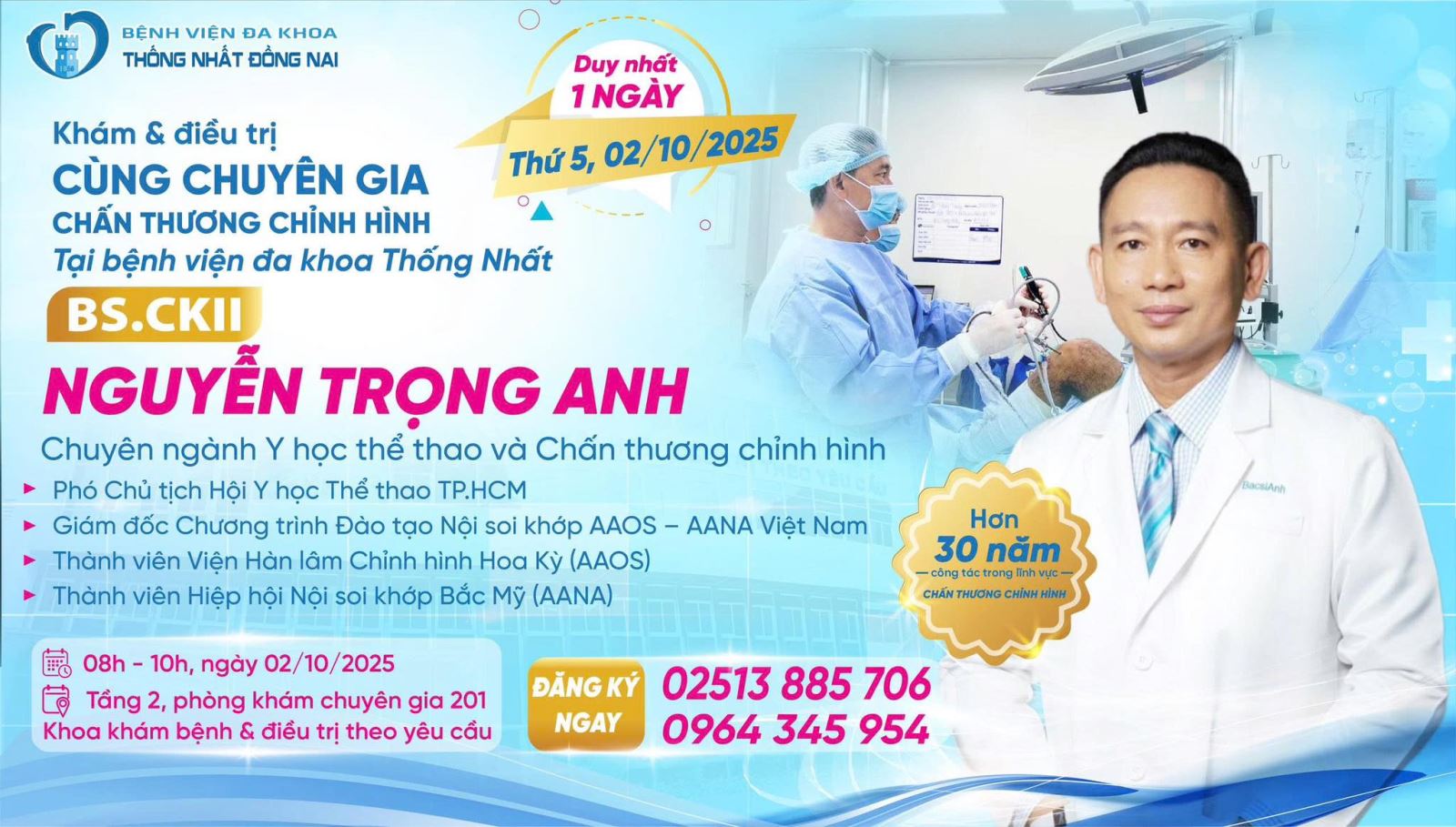 Bệnh viện Đa khoa Thống Nhất Đồng Nai hân hạnh thông báo: BS.CKII Nguyễn Trọng Anh, chuyên gia hàng đầu về chấn thương chỉnh hình – y học thể thao – nội soi khớp, sẽ trực tiếp khám và tư vấn cho người bệnh tại bệnh viện.