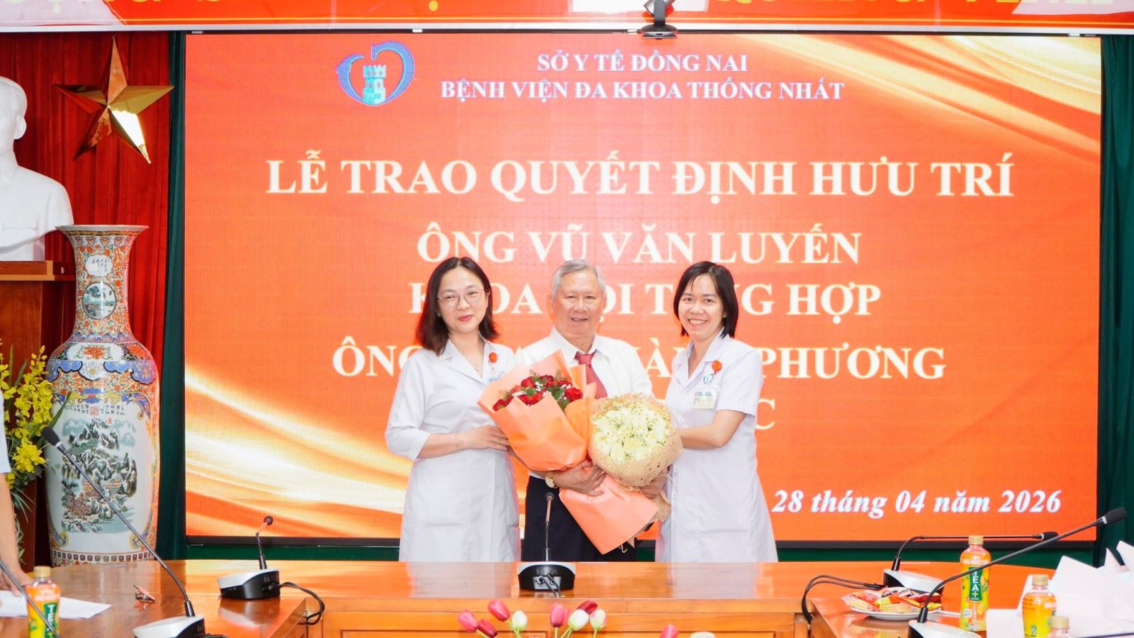 Sáng ngày 28/4/2026, Bệnh viện Đa khoa Thống Nhất Đồng Nai đã trang trọng tổ chức Lễ trao quyết định nghỉ hưu cho ông Vũ Văn Luyến (Phó Trưởng Khoa Nội Tổng hợp) và ông Phan Thành Phương (Nguyên Kỹ thuật viên trưởng Khoa Dược).